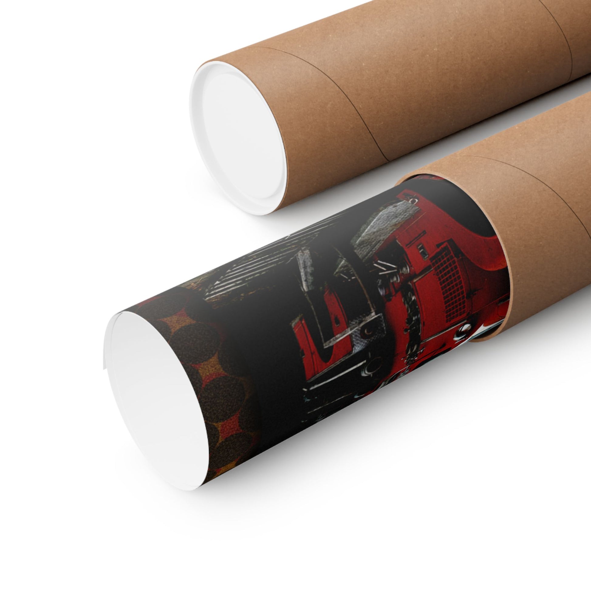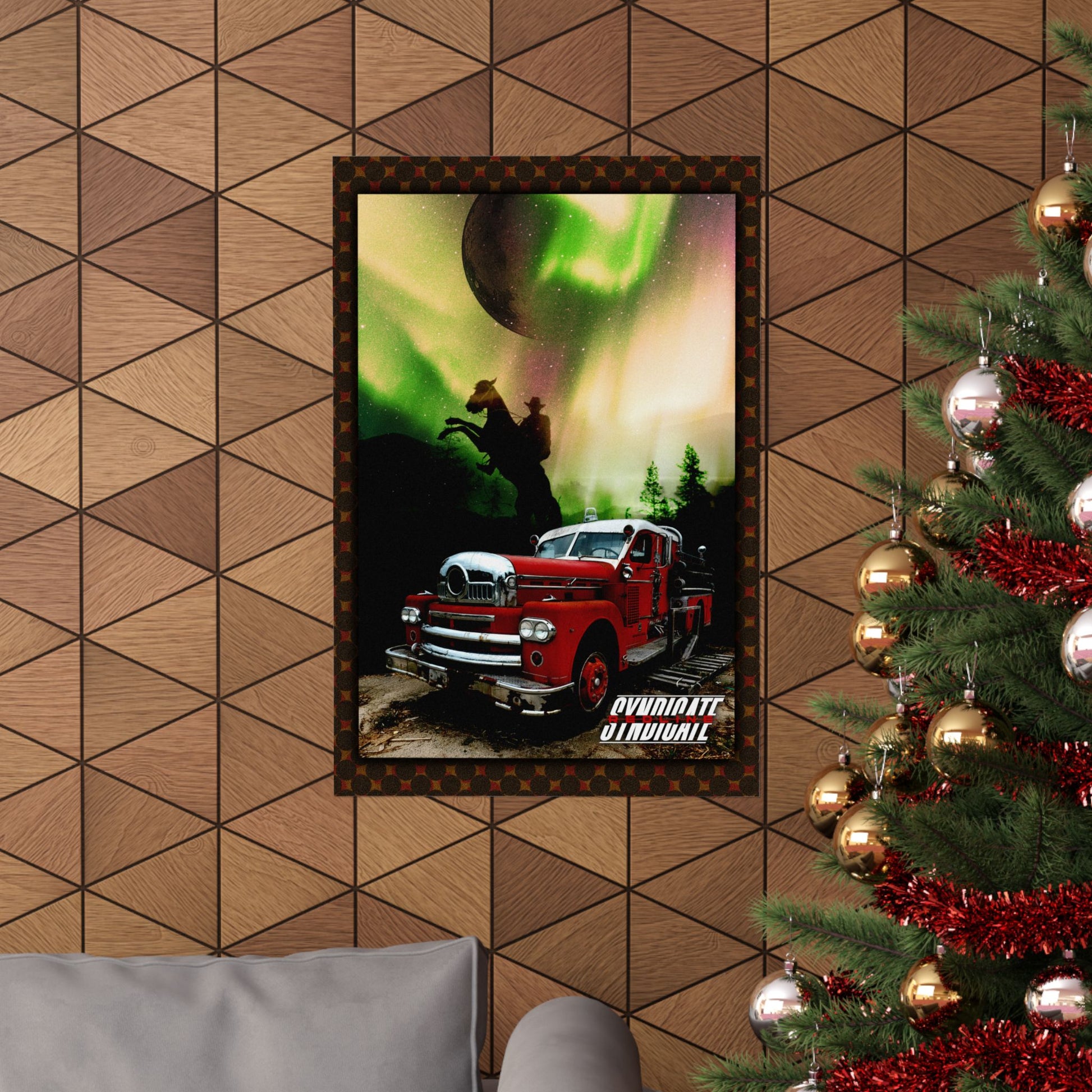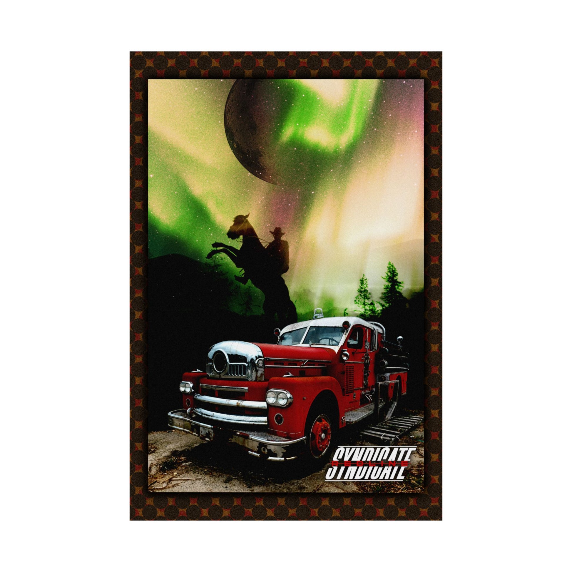 This matte vertical poster brings together vintage grit and otherworldly skies. A classic red fire truck sits ready on a rugged road while a silhouetted rider rears against a forest and swirling aurora — colors rendered deep and velvety by giclée printing on museum‑grade archival paper. The matte finish softens glare and gives the scene a painterly, tactile look on walls where storytelling matters: a studio, a den, a themed cafe, or a collector’s gallery. Available in many sizes for indoor display, it ages gracefully and keeps its vibrancy under regular light. Slight size tolerances reflect careful production; the result is a long‑lasting art print that feels lived‑in and cinematic.